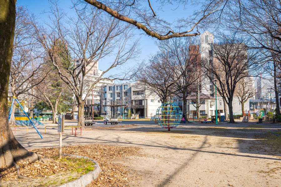 老松小学校の南側に隣接する中規模の公園。都心部に近い公園でありながら幼児向けの遊具が充実しています。また、フェンス付きのグラウンドがあり、球技やボール遊びもできるのも魅力です。公園内は大きな木がたくさんあり、地域住民の憩いの場となっています。毎年8月には地域の夏祭りが開催されています。 →地図