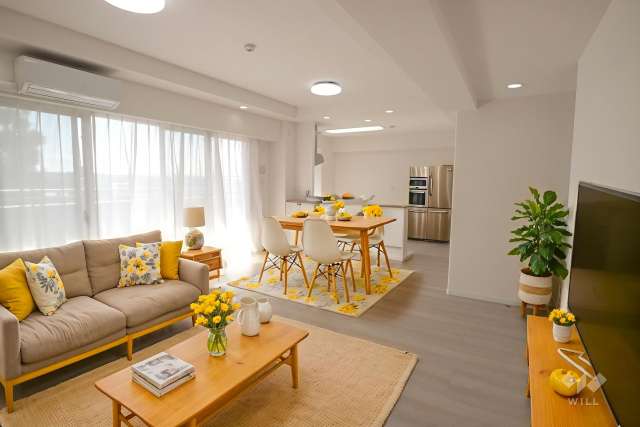 クロス張替え(全室)、フローリング張替え(LD・K・玄関土間)、フロアタイル張替え(洗面室・トイレ)、収納扉交換(一部)、食洗機交換、洗面台交換、トイレ交換、ウォシュレット交換、ユニットバス交換、浴室乾燥機交換、下駄箱交換、ハウスクリーニングなど