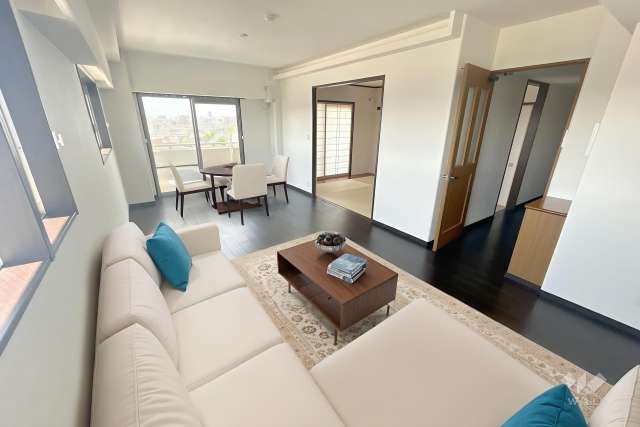 クロス張替え(全室)、エコカラット貼、フローリング張替え(廊下・LD・K・洋室7.1帖・洋室6.1帖・洋室5帖)、フロアタイル張替え(洗面室・トイレ)、畳新調、襖張替え、網戸張替、障子張替、キッチン交換、トイレ交換、ユニットバス交換、洗面台水栓交換、洗濯水栓交換、洗濯パン交換、建具レバー交換、間接照明新設、ハウスクリーニング