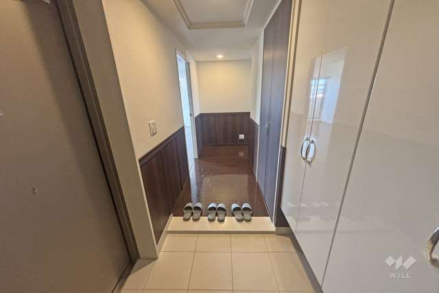 この物件は眺望に優れた最上階・7階部分、南東角部屋で日当たり・通風良好です。間取りは専有面積113.37平米の3LDK。引き回しバルコニーに全居室が面した開放感のあるプラン。バルコニーは32.77平米あり、トランクルームとスロップシンクが設けられています。玄関先から室内を見通せないプライバシー性の高い造り。2か所のウォークインクロゼットなど収納が充実しているのもポイントです。付帯設備は洗浄便座、シャンプードレッサー、浴室乾燥機、追焚機能、TV付きインターホンなど…。また、敷地内駐車場に空きがあり、月額使用料は9,000円~17,000円です(2025年2月時点)。現在は空き部屋です。