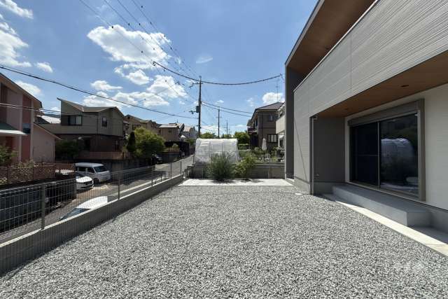 敷地面積は約70坪。南付け道路で日当たり良好。接道間口は約13mのゆとりがあります。敷地内に高低差があり、建物建築部分は前面道路から一段上がった場所にありますが、接道部分はフラット。車2台分の駐車スペースがあり、うち1台分は電動リモコン付きシャッター付きの掘り込み車庫が設置されています。(車種による)。車庫には、EV充電用200Vコンセントもあります。建物は2023年10月築、木造2階建ての築浅物件です。間取りは延床面積92.86平米(車庫面積約16.95平米含む)の2LDK。出幅のある広いバルコニーが魅力のプラン。洗濯物を干すだけでなく、テーブルセットを置いてアウトドアリビングとしても使用可能です。19帖大のLDKは上部吹抜けで開放的。シューズクロークやウォークインクロゼットなど収納スペースが充実しています。玄関扉はカードキー採用。付帯設備は食器洗浄機、浄水器、IHクッキングヒーター、洗浄便座、浴室乾燥機、追焚機能、TV付きインターホン、ガス温水式床暖房など…。現況は居住中。耐震基準は3等級を取得済み。室内は丁寧に使用されています。