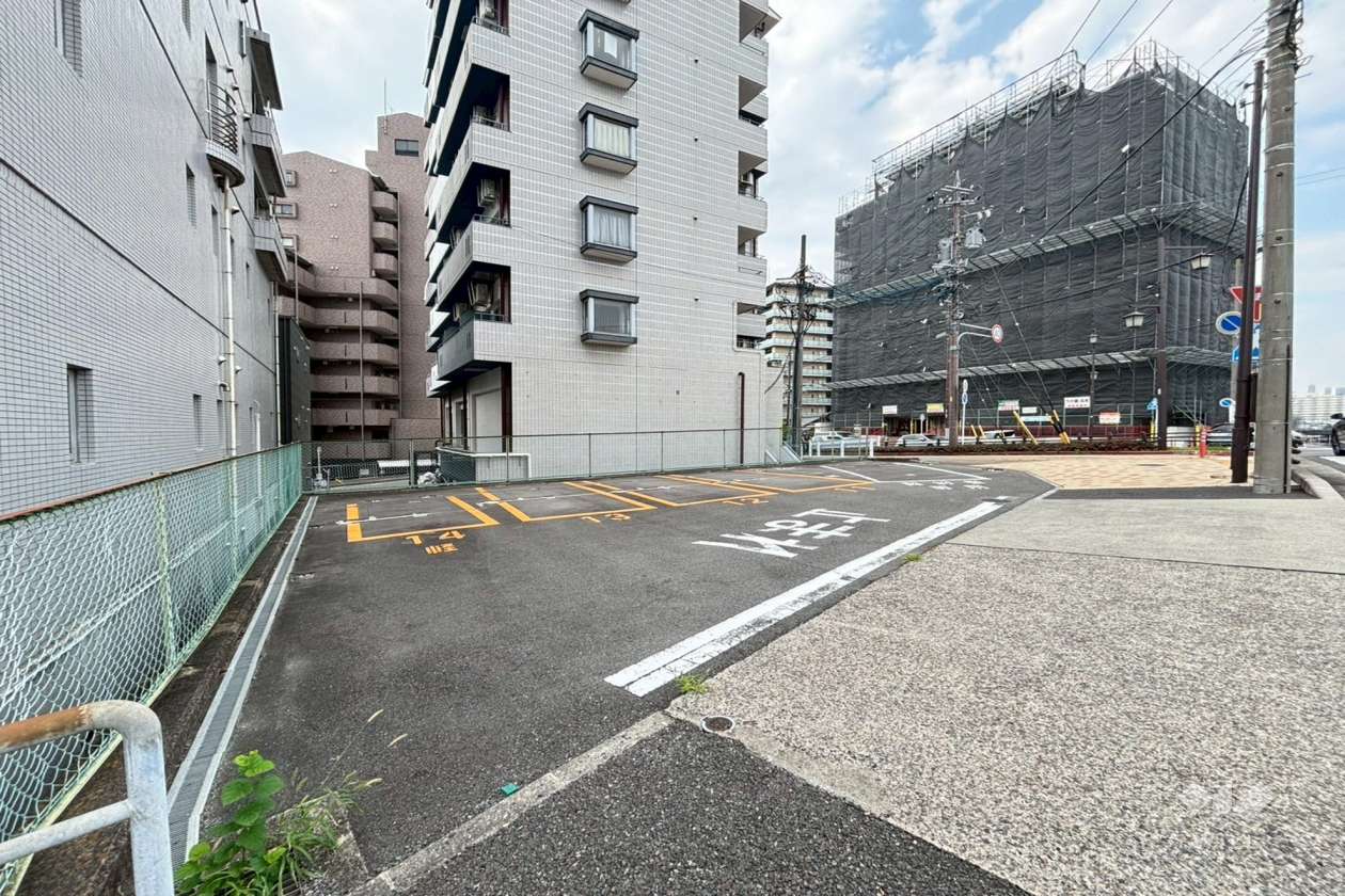 敷地面積は約39坪。敷地の北と北東が接道する角地で、採光・通風良好。北側は二車線のバス通り(尾頭橋通り)に面しているためやや車の音がありますが、道幅が広く、また東側は堀川に面した開放的な立地です。敷地と道路の高低差はありません。現況はアスファルト敷きの駐車場です。