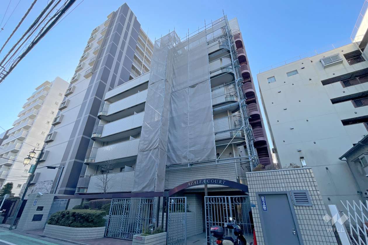 『アゼリアコート』は、JR山手線「新大久保駅」から徒歩4分、『新宿区百人町2丁目』にある総戸数37戸の中規模マンションです。複数駅が利用可能で、JR総武線「大久保駅」とJR中央線「大久保駅」からは徒歩7分の距離にあります。周辺は商業地域内の店舗や事務所が多く立ち並ぶ町。敷地は所有権。建物はRC造9階建てで、施工は竹中工務店です。