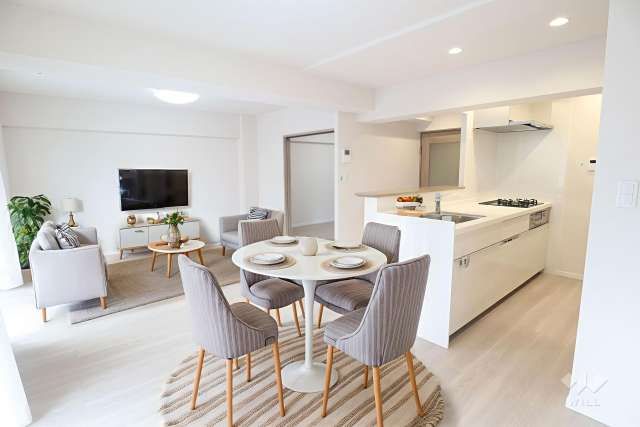 クロス張替え(全室)、フローリング張替え(廊下・LD・K・洋室5.8帖・洋室5.7帖・洋室4.8帖)、フロアタイル張替え(玄関・洗面室・トイレ)、扉交換(全室)、収納扉交換(全室)、キッチン交換、食洗機交換、シャワー付洗面化粧台交換、防水パン交換、トイレ交換、ウォシュレット交換、ユニットバス交換、給湯器(マルチリモコン付き)、配管(排水・給水・給湯管)更新、エアコン(洋室5.8帖・洋室5.7帖)、エアコン先行配管(洋室4.8帖)、カラーTVモニター付インターホン、ハウスクリーニング。