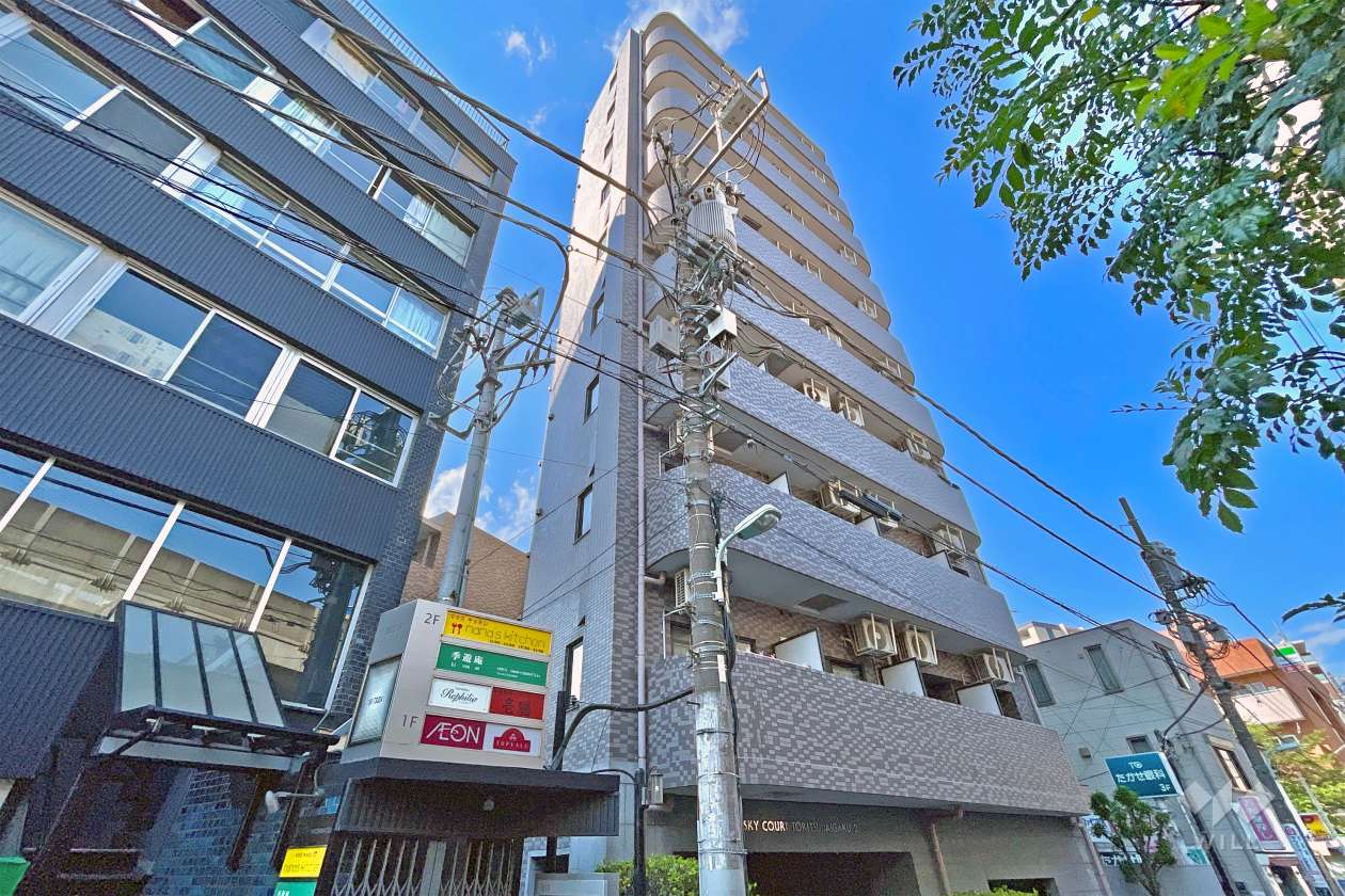 『スカイコート都立大学第2』は、東急東横線「都立大学駅」から徒歩2分、『目黒区中根1丁目』にある総戸数45戸の中規模・デザイナーズマンションです。複数駅が利用可能で、東急大井町線「緑が丘駅」からは徒歩17分の距離にあります。周辺は第一種中高層住居専用地域と商業地域内の一部店舗や事務所、主に集合住宅と一戸建てが立ち並ぶ住宅地。北西側を目黒通りが走り、町内に「呑川本流緑道」があります。「呑川本流緑道」は世田谷区新町から緑が丘駅まで続く約3kmの緑道で、お散歩コースにピッタリの場所。春には桜が楽しめます。地勢は丘陵地で、標高は約30m。道幅5m前後の一方通行の道路が多く、街路は一部やや入り組んでいます。生垣や庭木のある家が点在し、町中の緑はやや多め。高速道路のインターチェンジまでは距離があります。敷地は所有権。建物はSRC造・一部RC造10階建てで、施工は長野建設です。エントランスにオートロックと宅配ボックス付き。なおペットの飼育は不可です。