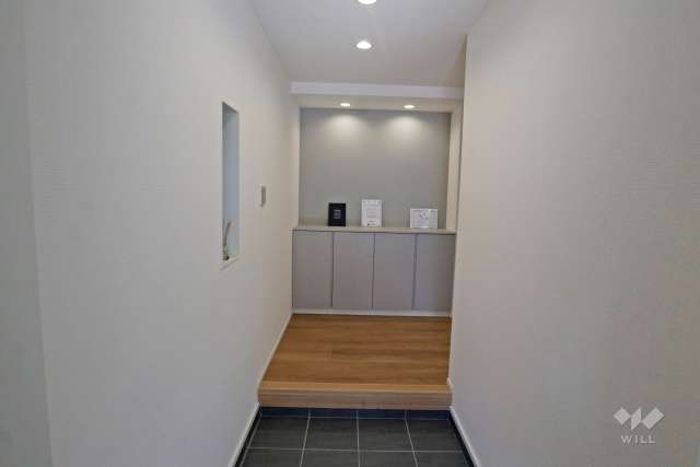 敷地面積は約24坪。全3区画の分譲地のうちの1区画。車2台分の駐車スペースがあります(車種による)。間取りは延床面積102.7平米の2SLDK。付帯設備は洗浄便座、追焚機能、ペアガラス、TV付きインターホン、24時間換気システムなど…。現況は完成済みのため、室内の見学ができます。