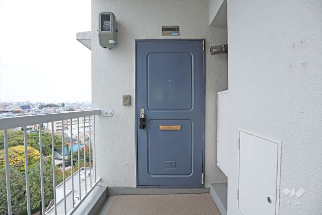 この物件は最上階・9階部分、南東角部屋。日当たり・通風良好です。間取りは専有面積45.93平米の2LDK。全居室洋室仕様の縦長リビングプラン。バルコニー側の洋室はLDKから出入りする造りです。キッチンと洗面室(洗濯機置場)の距離が近く、炊事・洗濯の家事動線良好。玄関ドアが室内廊下のサイド側に設けられており、ドアの開閉時に中を見られにくくなっているのもポイント。バルコニー面積は9.6平米(概算)。現況は空き部屋です。