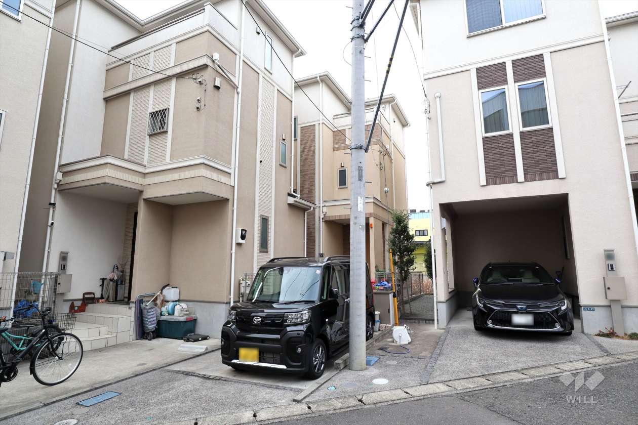 敷地面積は約28坪(路地状部分約20平米含む ※概算)。南付け道路。車1台分の駐車スペースがあります(車種による)。建物は2017年5月築の木造3階建て。間取りは延床面積109.3平米の4LDK。2階リビングのプラン。現況は居住中です。