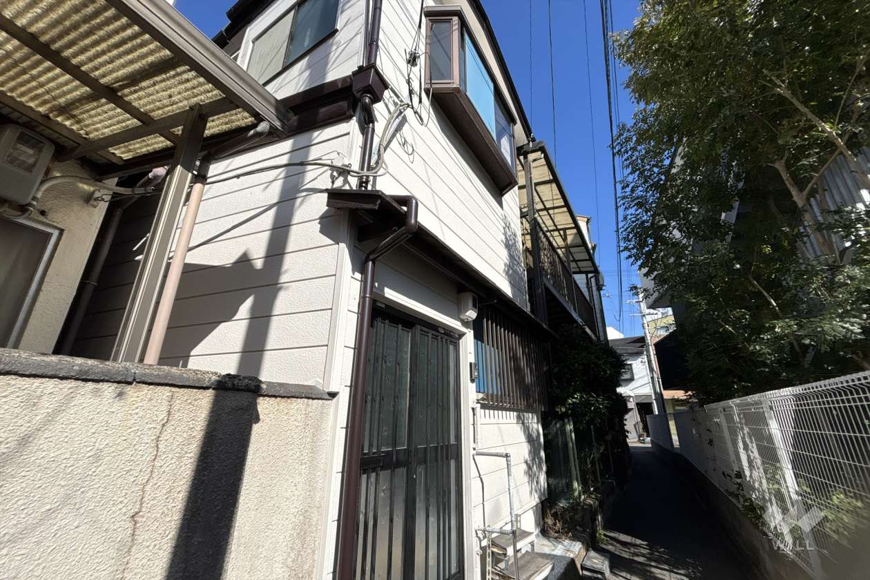 敷地面積は約10坪(別途、約2.6平米の私道負担有り)。南付け道路で採光良好。駐車スペースはありません。建物は1960年6月築の木造2階建て。間取りは延床面積45.12平米の3SK。現況は空き家です。