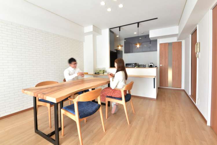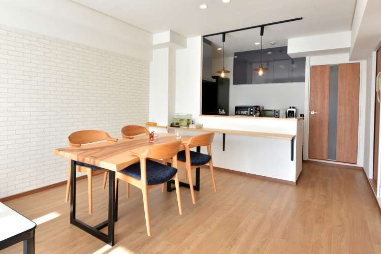お客様が一目惚れした一枚板に合うように明るい色味で統一しつつ、クロスでアクセントを入れ、お客様ならではのお住まいとなりました。