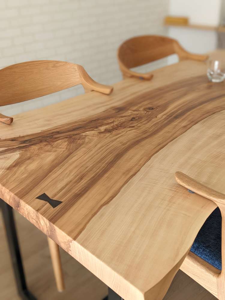 十二十家具のショールームで一目惚れされた栃の一枚板をダイニングテーブルに。