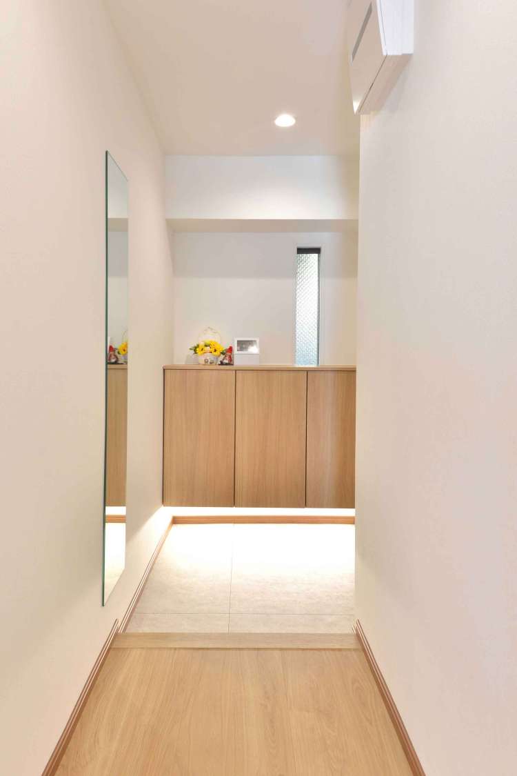 玄関の靴箱の下には間接照明を仕込みました。
