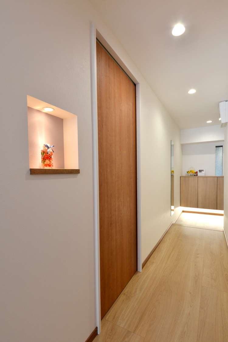 廊下のニッチのダウンライトは飾り棚をディスプレイのように照らしてくれます。